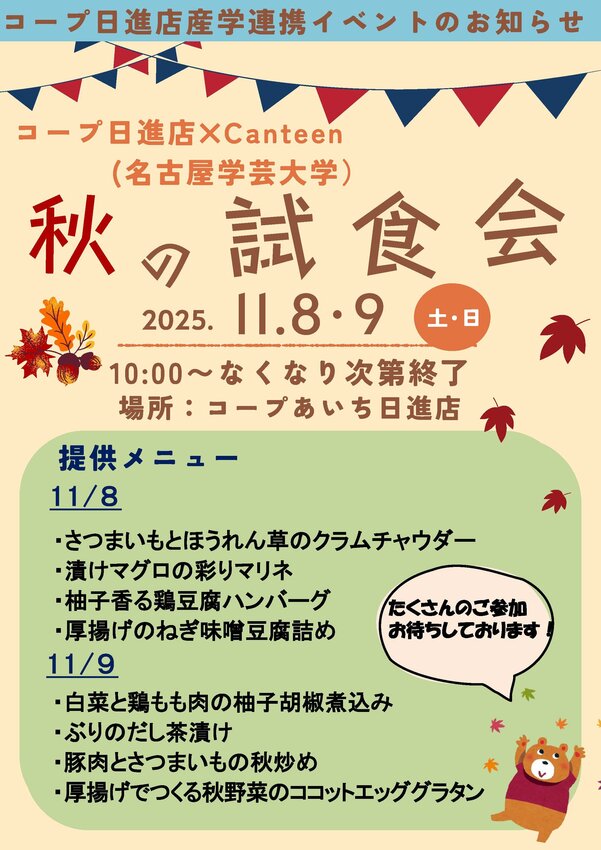2025年11月8日(土)と9日(日)の2日間、コープあいち日進店で試食会を開催しました。