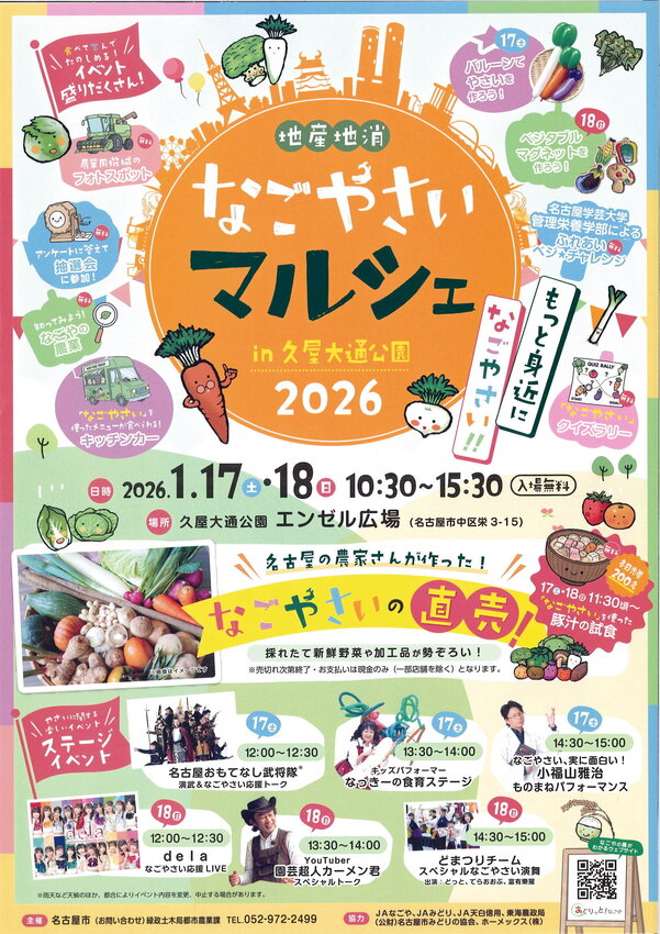 名古屋の農家さんが育てた「なごやさい」の魅力を発信する、「なごやさいマルシェ in 久屋大通公園2026」(主催:名古屋市)が1月17日(土)・18日(日)に久屋大通公園エンゼル広場にて開催されます。